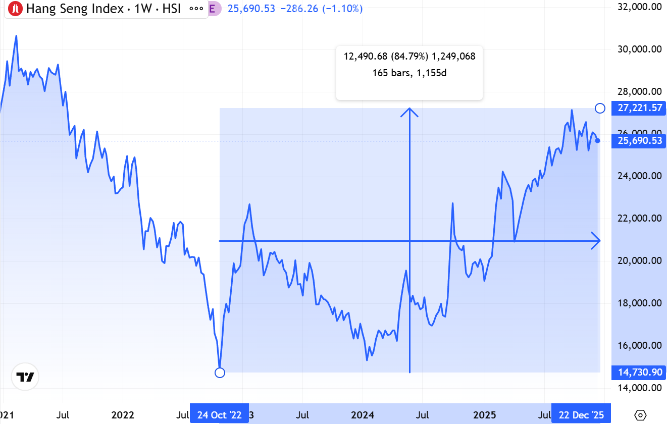 This dynamic explains a recurring pattern in Hong Kong equities: sharp, policy-driven rallies followed by rapid retracement. When Beijing signals support through easing measures, verbal guidance, or sector-specific relief, Hong Kong reacts immediately. Liquidity returns, short covering accelerates, and valuations snap higher. But absent a clear follow-through in domestic demand, property stabilization, and regulatory clarity, these rallies struggle to sustain. The market reverts to pricing China as a trading venue, not a compounding one.