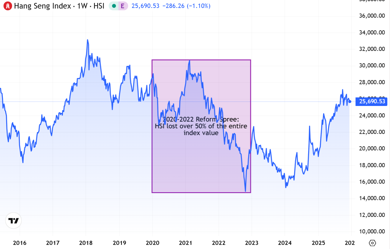 Hong Kong’s equity market sits downstream of China’s growth narrative, but upstream of its policy discretion. As a result, it absorbs the negative externalities of China’s economic transition more directly than mainland markets. Weak domestic demand, unresolved property adjustments, and uncertain policy signaling do not manifest in Hong Kong as cyclical volatility alone; they manifest as duration compression. Global investors shorten their time horizons, reduce terminal value assumptions, and demand higher risk premia for holding Chinese cash flows offshore.